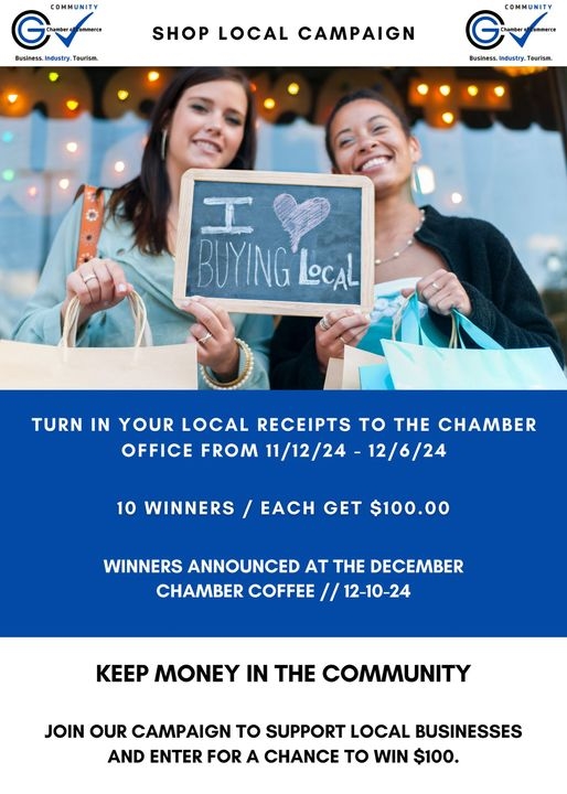 Over the next few weeks, any money you spend in the GCV area will give you an opportunity to win $100. You can bring as many receipts as you want, but you will only be eligible to win one time this year. The GCV Chamber does this as a way to give back to our community while also encouraging you to shop in our community.