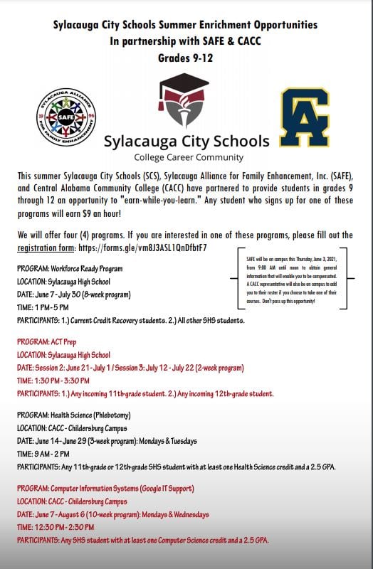 SYLACAUGA, Ala. – This summer, Sylacauga City Schools are partnering with Central Alabama Community College and the Sylacauga Alliance for Family Enhancement to offer students the opportunity to earn cash while enriching in their academics.