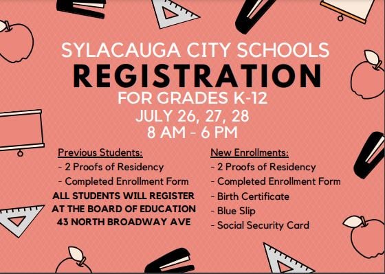Registration will take place at the Sylacauga City Schools Board of Education, located 43 North Broadway Ave.