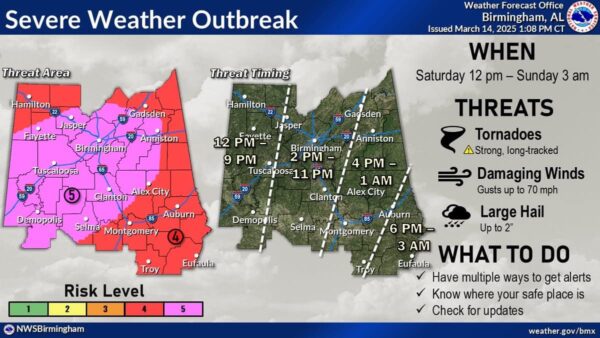 SYLACAUGA, Ala. – A significant severe weather event is expected to impact Talladega County and the Coosa Valley area on Saturday, March 15, with the potential for life-threatening conditions. The National Weather Service has elevated the risk level to 5 out of 5 for central Alabama, including the Greater Sylacauga area.