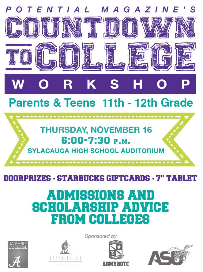 SYLACAUGA, Ala. – Sylacauga High School will host the Countdown-to-College workshop with Potential Magazine on Thursday, Nov. 16 from 6:00-7:30 p.m. This workshop is packed with information designed to help 11th and 12th graders and their parents prepare for the college admissions process.