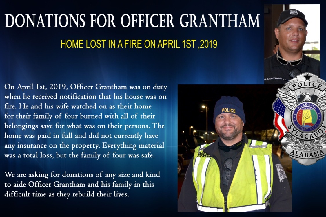 All donations of any kind are appreciated and all monies go to Officer Grantham and his family during this difficult time of rebuilding.