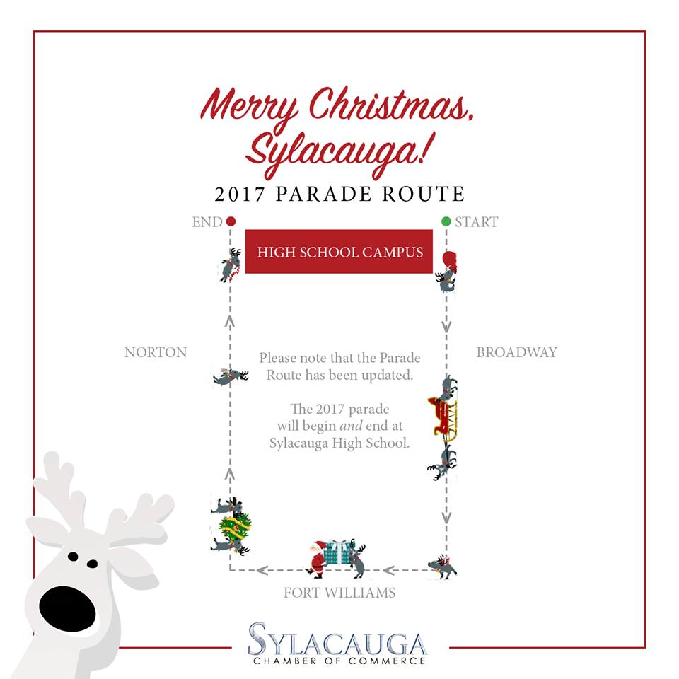 The parade is now set to begin on Broadway Ave. at Sylacauga High School and travel south. It will then  turn right onto W. Fort Williams St., and then make an immediate right onto N. Norton Ave. The parade will continue North and conclude on the rear side of Sylacauga High School.