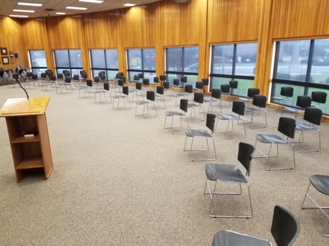 The city is taking measures to protect the public while meeting requirements of open public meetings. This photo shows how seating for tonight has been rearranged to create recommenced separation between attendees.