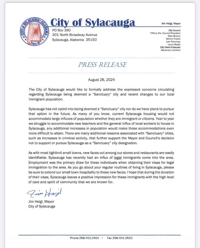 “The City of Sylacauga would like to formally address the expressed concerns circulating regarding Sylacauga being deemed a “Sanctuary” city and recent changes to our local immigrant population.