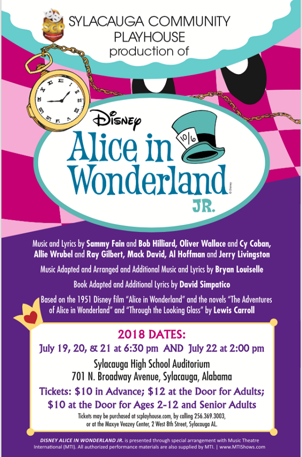 From the perpetually-tardy White Rabbit, to the Mad Hatter, to the tyrannical Queen of Hearts and a host of other unforgettable characters, the residents of Wonderland become “curiouser and curiouser” as Alice wanders further into her magical adventure. Based on the 1951 Disney film “Alice in Wonderland” and the novels “The Adventures of Alice in Wonderland” and “Through the Looking Glass” by Lewis Carroll, the 2018 SCP production of “Disney’s Alice in Wonderland Jr.” will be performed July 19-22 in the Sylacauga High School auditorium.