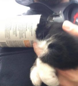 Her furry friend lodged its head in a tin can the day after Thanksgiving. Firefighter Scott Kines said he helped free the puppy by pulling its head out of the can.