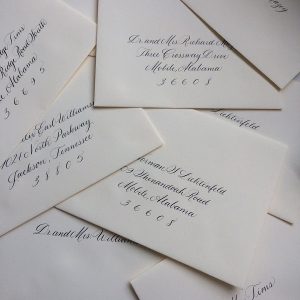 Hall currently works with three or four wedding planners where she provides elegant, traditional pointed pen calligraphy for weddings and other special events.  She addresses over 1,000 envelopes per month, averaging 15-20 envelopes per hour.  This month she is working on 800 gold embossed wedding invitations for a bride in Mountain Brook.