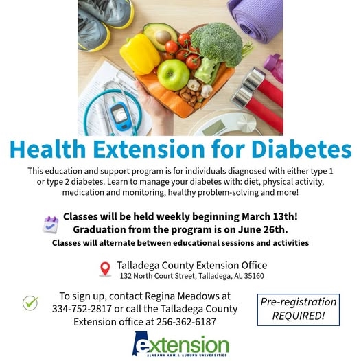 TALLADEGA, Ala. – With diabetes reported at epidemic levels across the country, the Talladega County office of the Alabama Extension Service has put together an education and support program for individuals diagnosed with either Type 1 or Type 2 diabetes.
