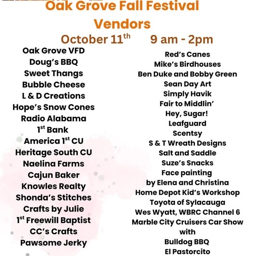 OAK GROVE, Ala. – The second Saturday of October means it’s time for the annual Oak Grove Fall Festival on Saturday, Oct. 11, and the committee has been working for months now, putting together the best event in the last 20 years.