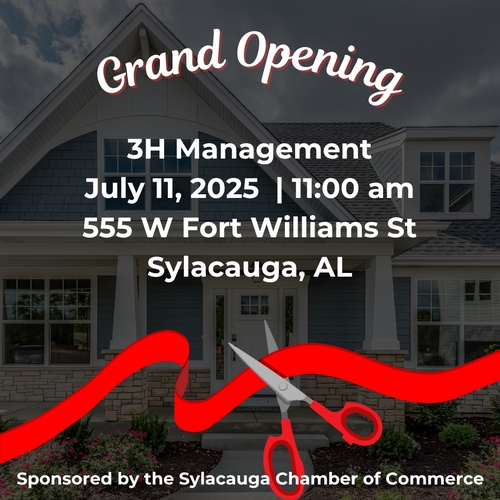 Next up is the ribbon-cutting celebration at 3H Management, located at 555 W Fort Williams St. in Sylacauga. Come find out all about 3H Management at the 11:00 a.m. event on Friday, July 11.