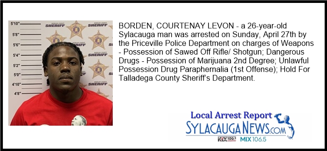 PRICEVILLE, Ala. – The Priceville Police Department has reported that a vehicle stop in the early morning hours of Sunday, April 27 resulted in charges against three Sylacauga men – Courtenay Levon Borden (26), Antwane Markeith Cook (27) and Lanoah Ealy, Jr. (27).
