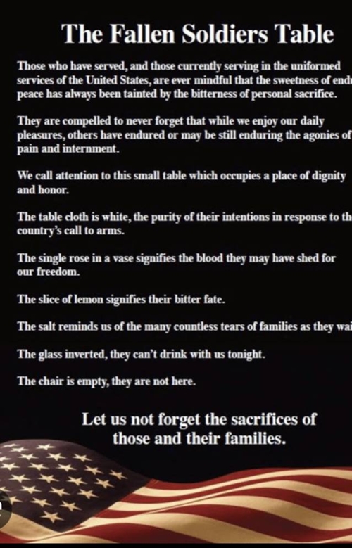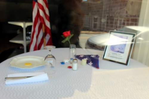 Special thanks also go to Chad Pearson, Judy Rochelle, Monty and Gaye Powell, and the City for allowing your buildings to display the Fallen Soldier’s Table and tributes.
