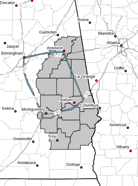 Cleburne, Coosa, Elmore, Lee, Macon, Montgomery, Pike,