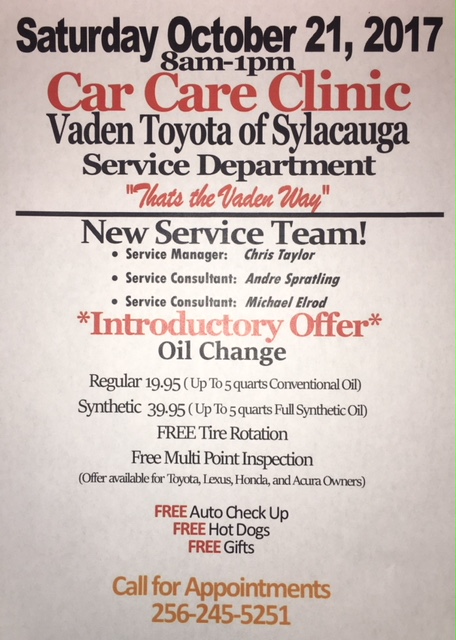 SYLACAUGA, Ala. – You use your car more any other purchase you have ever made. It is with you on vacations, those long Monday morning drives into work, and on a nice Sunday stroll after church. It is important that your car is treated with care and fully ready to go on its next drive. If you have not had your vehicle inspected lately, Saturday, Oct 21. from 8 a.m. to 1 p.m. at Vaden Toyota is the time and place to get that done.