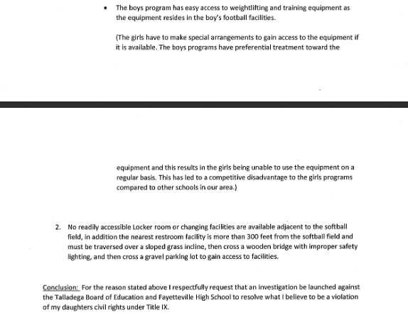 FAYETTEVILLE, Ala. – In December 2017, a detailed Title IX complaint was filed to the Department of Education Office for Civil Rights against Fayetteville High School (FHS) and the Talladega County Board of Education (TCBOE).