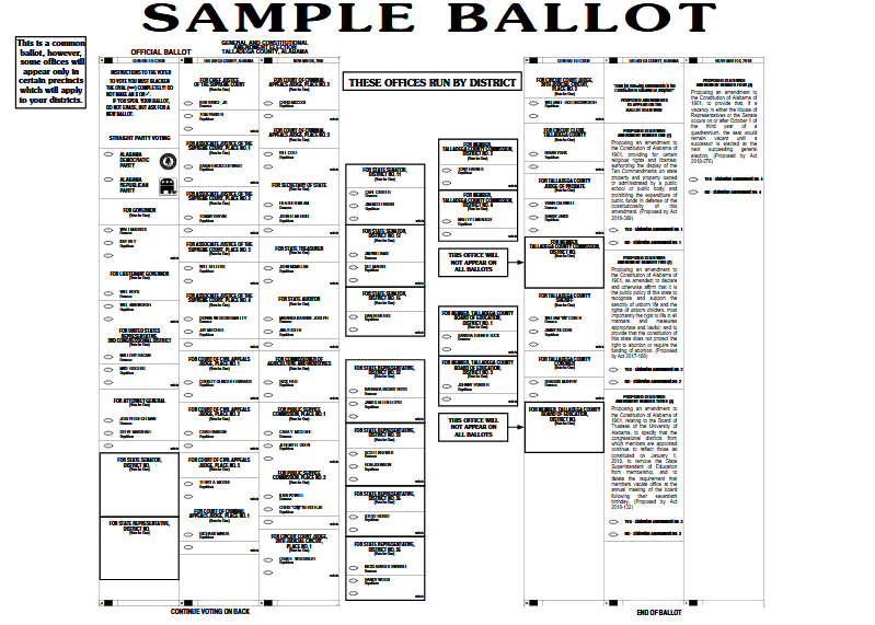 View all sample ballots on the Alabama Secretary of State website. Below is the Talladega Co. sample ballot.