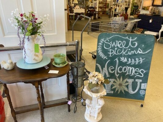 Sweet Pickins’ is an antique mall where vendors can rent booths and sell all sorts of unique items. Whether you’re looking for hair bows, jewelry, or Darth Vader with a candy cane, owner Patti and manager Tabitha probably have it at their “happy place.”