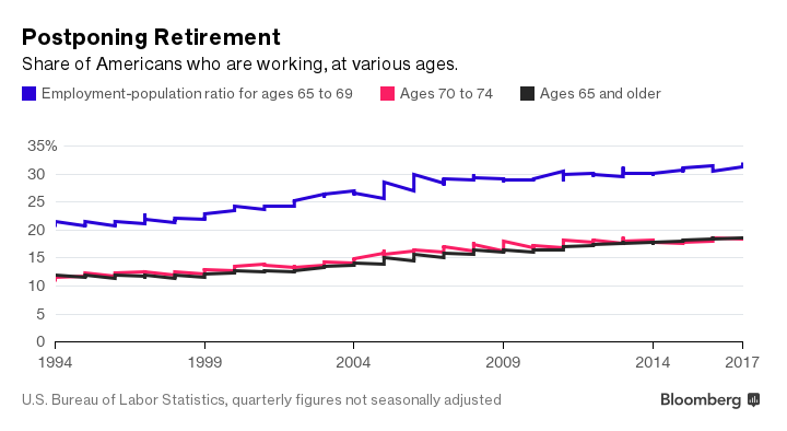 Almost 19 percent of people 65 or older were working at least part time in the second quarter of 2017, according to the U.S. jobs report released July 14. The age group’s employment/population ratio hasn’t been higher in 55 years, before American retirees won better health care and Social Security benefits starting in the late 1960s.