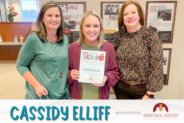 Congratulations to our Teacher of The Month sponsored by Heritage South Credit Union for the month of November, Cassidy Elliff!