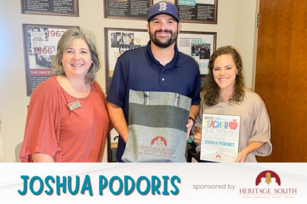 Congratulations to our Teacher of The Month sponsored by Heritage South Credit Union for the month of October, Joshua Podoris!